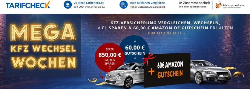 Kürzlich machten wir euch auf die aktuelle BestChoice-Aktion von Tarifcheck aufmerksam, jetzt legen wir nach: Wenn ihr bis 30.11. diesen Jahres, also bis zum alljährlichen Versicherungswechsel-Stichtag, den KFZ-Versicherungsvergleich über das Vergleichsportal Tarifcheck vornehmt, erhaltet ihr einen 60€-Amazon-Gutschein als Prämie. Was ihr dafür tun müsst, erfahrt ihr wie gewohnt unten im Artikel. 🙂