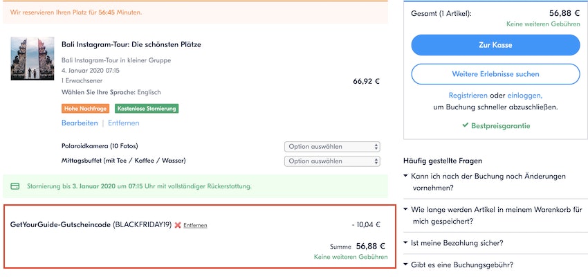 Legt die gewünschte Aktivität in den Warenkorb, nachdem ihr das genaue Datum und die Anzahl der Tickets gewählt habt. Im Anschluss könnt ihr unter der Zusammenfassung eures Einkaufs den Gutscheincode eintragen. Der Rabatt wird sofort vom verbleibenden Gesamtpreis abgezogen.