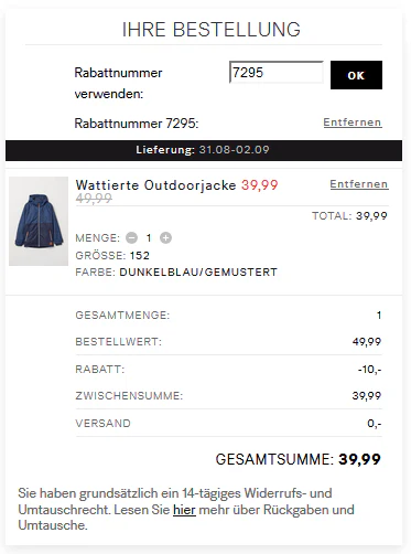 Hier seht ihr noch, wie der Gutscheincode euren Warenkorb vergünstigt und die Versandkosten streicht:
