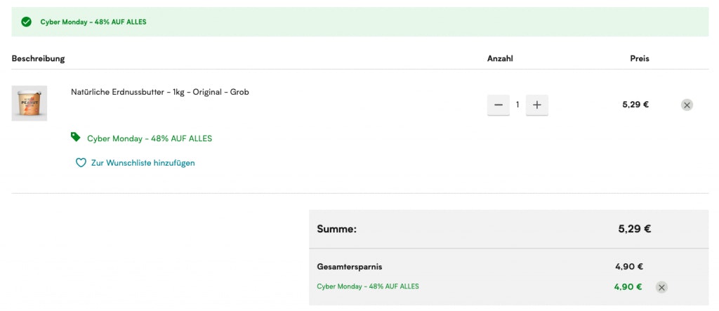 Euren Rabatt könnt ihr ganz einfach einfordern: Gebt den Gutscheincode Cyber im Warenkorb ein und zack, schon zahlt ihr nur noch die Hälfte. 🙂