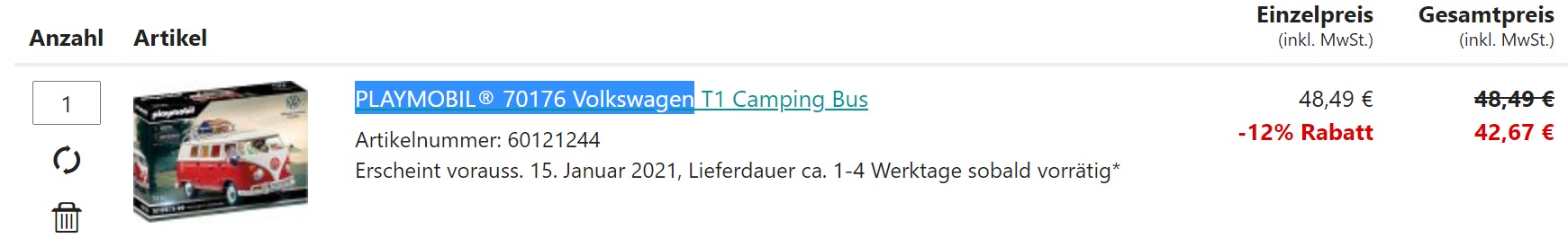 - Playmobil Volkswagen T1 für 42,67€ inkl. Versand bei Buecher.de (Preisvergleich: 55€)