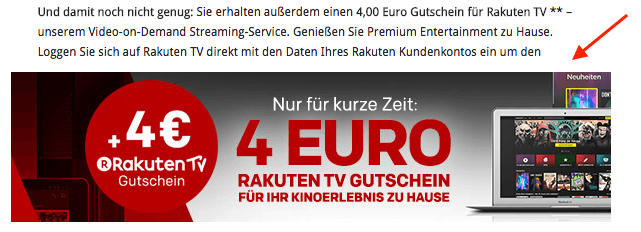 Nachdem ihr euch bei dem Rakuten-Newsletter angemeldet habt, erhaltet ihr eine Anmeldungs-Mail. Diese bekommt ihr nach wenigen Minuten. Wichtig ist, dass ihr mit dieser E-Mail eure Anmeldung bestätigt. Anschließend erhaltet ihr eine weitere E-Mail. Diese enthält sowohl den 10€-Gutscheincode für das Shopping bei Rakuten, als auch den Gutschein für den Gratis-Film. Während der 10€-Rabatt als Code hinterlegt ist, bekommt ihr den 4€-Rabatt für den Film über einen Klick auf das entsprechender Banner.
