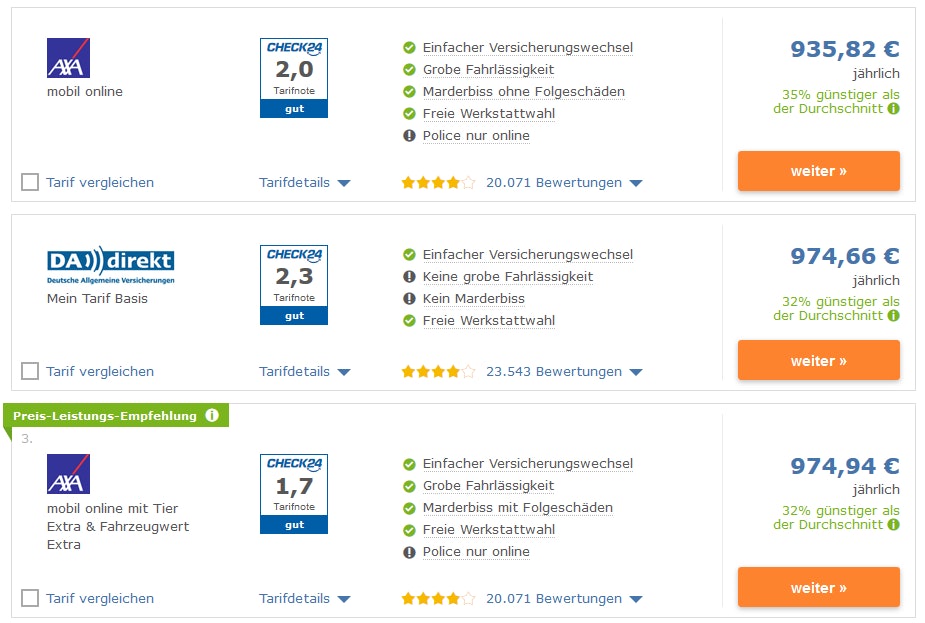 Achtung tatsächlich ist das Ergebnis nicht in allen Fällen 1:1 dasselbe wie bei check24.de.