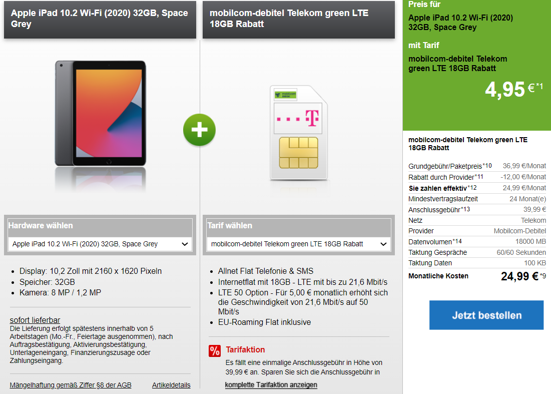 | Mobilcom-debitel Telekom green LTE 20 GB Tarif für 15€/Monat – 20 GB LTE, Allnet- & SMS-Flat |