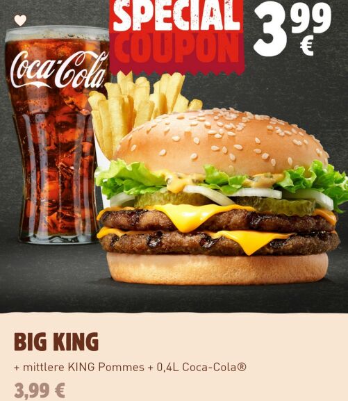 | 31605 | 2 Big King + mittlere King Pommes + 0,4l Coca Cola | 7,49 € |