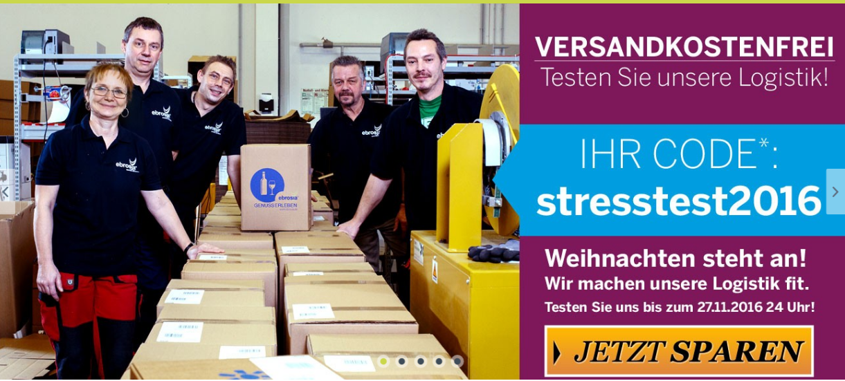 Der Versand von schweren Getränkeflaschen ist im Internet bisweilen sehr teuer. Ebrosia bietet faire Versandkosten und keinen Mindestbestellwert, so dass du dir bei Bedarf sogar einzelne Weinflaschen nach Hause liefern lassen kannst. Der Versand durch den Logistikpartner DHL dauert in der Regel nur 1-3 Tage und erfolgt zum Pauschalpreis von 4,95 Euro. Eine Lieferung ins Ausland ist derzeit nur nach Österreich möglich. Wenn du deine Sendung zu einem bestimmten Zeitpunkt erhalten möchtest, kannst du einen Wunschtermin für die Lieferung angeben.