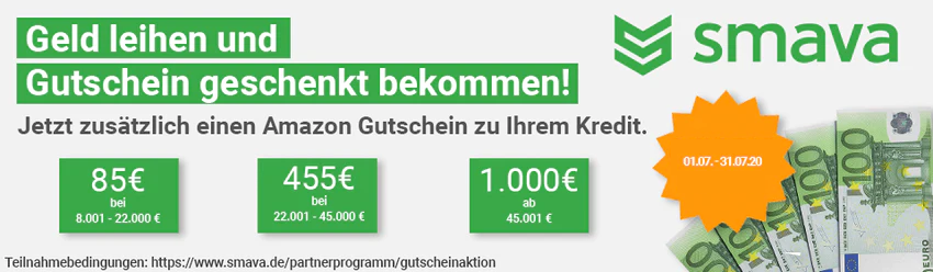 Kreditvergleich bei Smava mit bis zu 1.000€ Amazon-Gutschein » ab 0,68% effektivem Jahreszins 💸