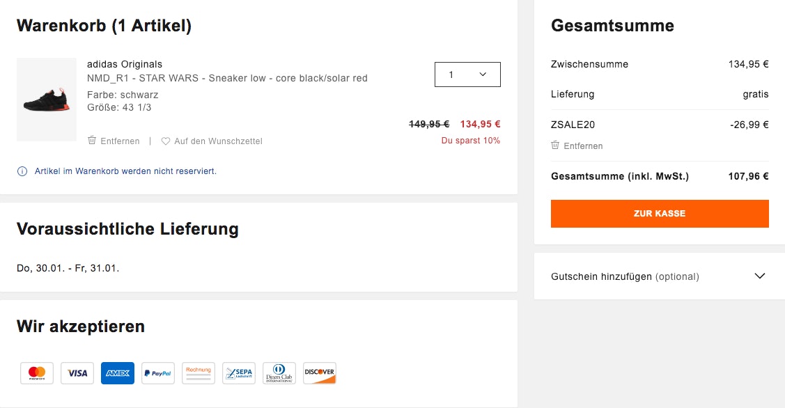 Zalando war einer der ersten Shops, die die Versandkosten gnadenlos gestrichen haben – sowohl bei der Bestellung, als auch bei der Retoure. Sorgenfreies und günstiges Shopping sind also garantiert. Anbei noch ein Screenshot aus dem Warenkorb, damit ihr seht, wie der Rabatt am Ende sichtbar wird: