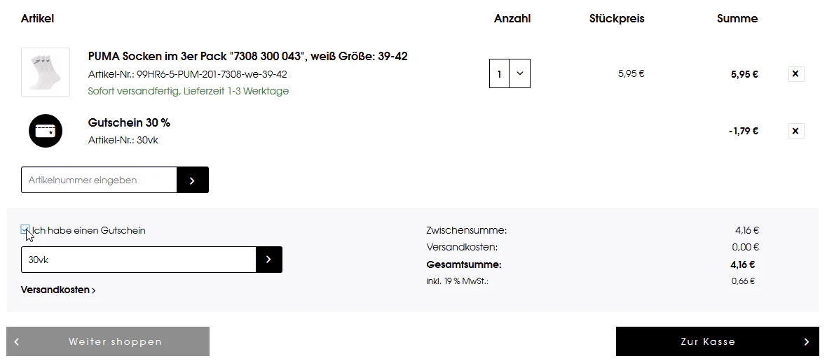 Auf den Preis kommt ihr durch einen Gutscheincode, der euch 30% Rabatt verspricht und zusätzlich noch die Versandkosten egalisiert. Für 4,17€ kann man hier also nichts falsch machen. Wer will kann auch die doppelte Menge einpacken und dann bleibt der Preis pro Socke der Gleiche. So sieht’s im Warenkorb aus: