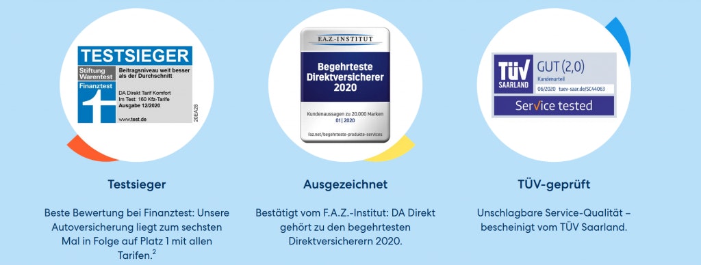 Das Ansinnen der zur Zurich Gruppe gehörenden DA Direkt ist es, „Versicherungsgeschäfte einfacher und bequemer“ zu machen. Dazu beitragen sollen beispielsweise neue Services im Bereich Versicherungen, so etwa ein Netzwerk von Zahnärzten, die Möglichkeit, die Versicherung detailliert online zu konfigurieren sowie ein Rund-um-die-Uhr-Service. Die folgenden Testsiegel wurden bereits vergeben: