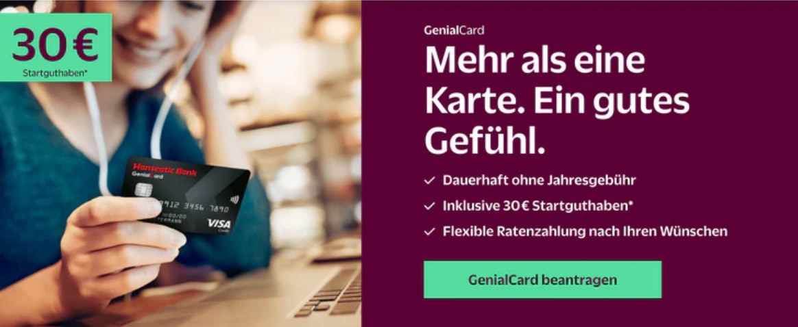 Top! Hanseatic GenialCard mit 30€ Startguthaben » kostenlose Visa-Kreditkarte weltweit ohne Gebühren 💳 |