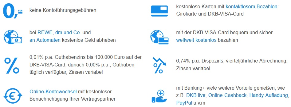 Das DKB-Girokonto ist dauerhaft kostenlos und damit uneingeschränkt zu empfehlen. Klar ist, dass es keine Filialen der DKB gibt und ihr so nicht mit der Girokarte kostenfrei Geld abheben könnt – aber dafür habt ihr ja die kostenlose Visa-Karte, mit der ihr weltweit an allen Geldautomaten kostenlos abheben könnt. Somit ist die Girokarte eigentlich nur noch für den bargeldlosen Einkauf gedacht. Mit eurer Girokarte und der Kreditkarte könnt ihr übrigens auch kontaktlos bezahlen. Hier seht ihr die Vorteile auf einen Blick: