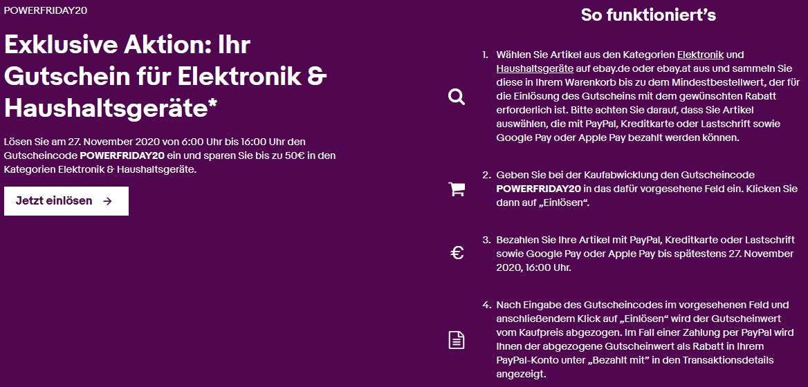 Der Gutschein kann im Warenkorb für maximal 10 Verkäufer und maximal 40 Artikel eingelöst werden. Der Gutschein kann vom 27. November 2020 6:00 Uhr bis zum 27. November 2020 16:00 Uhr eingelöst werden. Der Gutschein POWERFRIDAY20 gilt nur beim Kauf eines Artikels aus den Kategorien Computer, Tablets & Netzwerk (58058), Foto & Camcorder (625), Haushaltsgeräte (20710), PC- & Videospiele (1249), Handys & Kommunikation (15032) und TV, Video & Audio (293). Der Gutschein kann 1-mal eingelöst werden; d.h. den Gutscheincode können Sie für 1 Einkauf bis zum o.g. Enddatum verwenden.