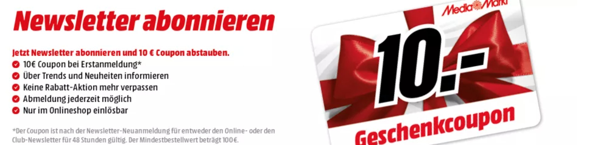 Weil jeder Euro beim Schnäppchen schlagen zählt, empfehlen wir euch, euch noch vor dem Einkauf für den Media Markt-Newsletter zu registrieren. Warum? Ganz einfach: Ihr erhaltet als kleines Dankeschön einen 10€-Coupon, den ihr ab einem Einkaufswert von 100€ sofort einlösen könnt. Meldet euch einfach hier an, euren Gutschein erhaltet ihr im Handumdrehen per Mail.