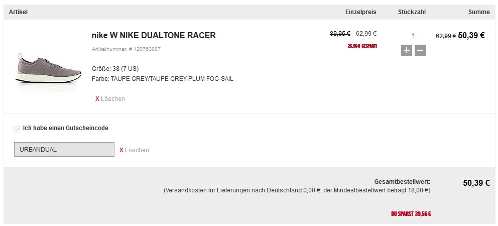 Das Sneakerportal Urban Sneakers hat wieder einen Gutschein für Kickz an den Start bekommen, bei dem ihr auf das gesamte Sortiment der Nike DualTone Racer Schuhe 20% Rabatt abstauben könnt. Damit könnt ihr den sportlichen Sneaker ab 50€ nach Hause geliefert bekommen. Wir haben euch ein paar günstige Varianten vorgestellt im Artikel