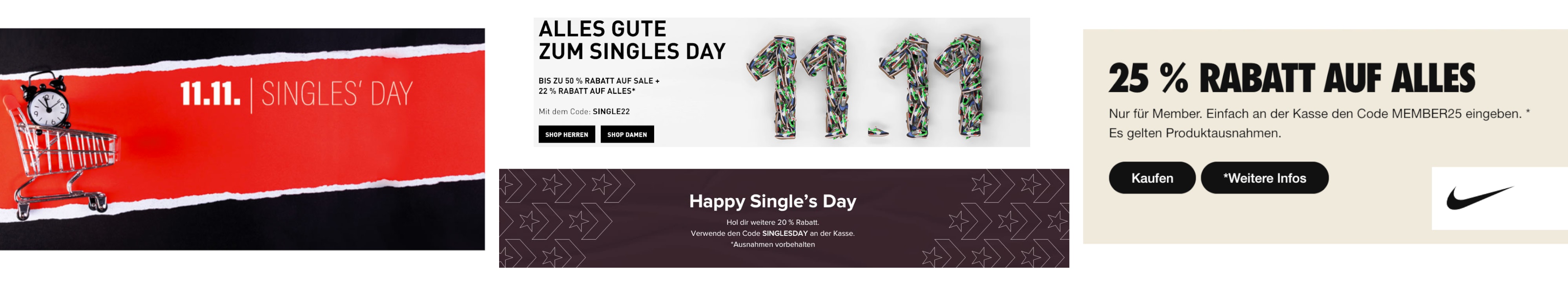 15% Rabatt auf reduzierte Kleidung & Schuhe bei SportScheck.de – Gutscheincode: SINGLE1511% Singles‘ Day Rabatt auf alles bei Sportspar.de – Gutscheincode: SINGLE11% Extra-Rabatt auf alles bei Aboutyou.de – Gutscheincode: SINGLE1111€ Singles‘ Day Rabatt ab 50€ MBW bei Jeans-direct.de – Gutscheincode: JD11SD22% Rabatt auf alles bei Snipes.com – Gutscheincode: SINGLE2222% Extra-Rabatt auf Sale zum Singles Day bei Puma.de – Gutscheincode: SINGLE22Singles‘ Day mit bis zu 50% Rabatt bei Newbalance.deNike Singles‘ Day mit 25% Rabatt auf fast alles bei Nike.de – Gutscheincode: MEMBER2533% Extra-Rabatt auf alles zum Singles‘ Day bei Eastpak.de – Gutscheincode: SINGLYTHEBEST20% Extra-Rabatt auf alles bei Planet-sports.de – Gutscheincode: GOENNDIR