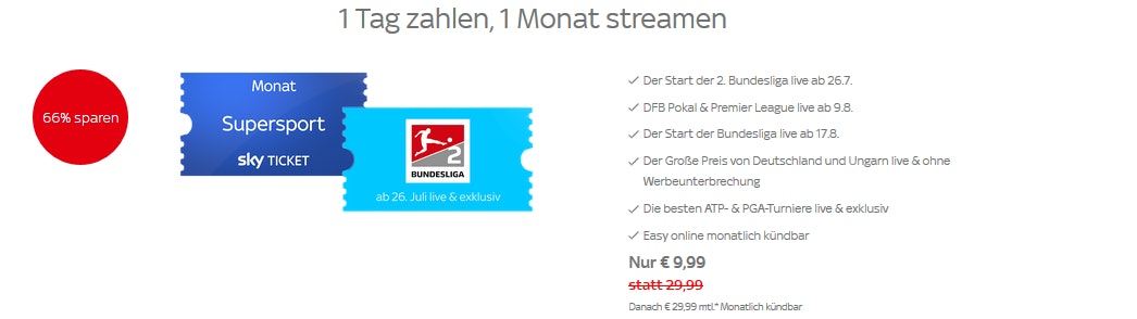 Supersport Monatsticket: Die Mindestvertragslaufzeit beträgt 1 Monat. Für die Dauer der Mindestvertragslaufzeit sind insgesamt einmalig € 9,99 zu zahlen. Der Gesamtbetrag ist zu Abonnementbeginn fällig. Ab dem zweiten Monat beträgt der Preis für das Supersport Monatsticket € 29,99 mtl. Laufzeit unbefristet. Das Monatsticket kann erstmals zum Ablauf der Mindestvertragslaufzeit, danach monatlich gekündigt werden. Alle Angebote nur buchbar für Sky Ticket-Neukunden ab 18 Jahren, die sich erstmalig bei Sky Ticket registrieren.
