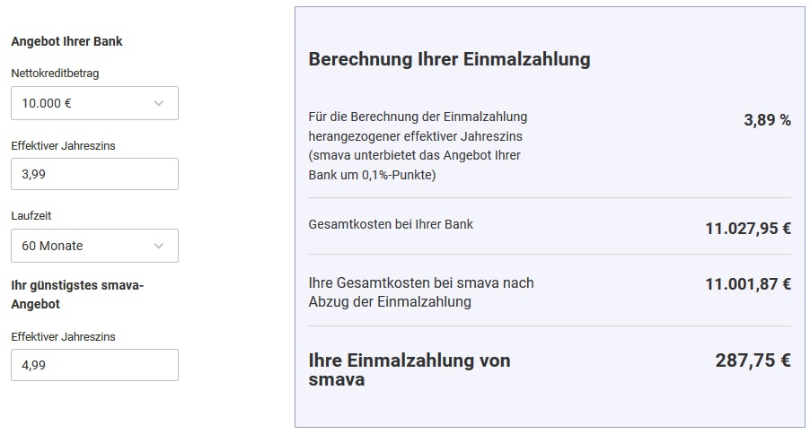 - Nach Ablauf der Widerrufsfrist erhaltet ihr von Smava eine ausgleichende Einmalzahlung, die das Referenzangebot dann in den Gesamtkosten um 0,1 Prozentpunkte unterbietet.