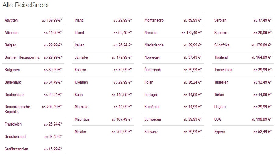Die günstigsten Ziele sind auf der Aktionsseite nach Abflughafen sortiert. Statt vor einiger Zeit noch mit Air Berlin, fliegt ihr nun viele deutschlandweite Strecken mit der Lufthansatochter an. Schaut man sich die Deutsche Bahn-Ticket-Preise an, stellt man fest, dass diese oft teurer als ein Flugtickets sind und daneben die Fahrzeit länger ist.