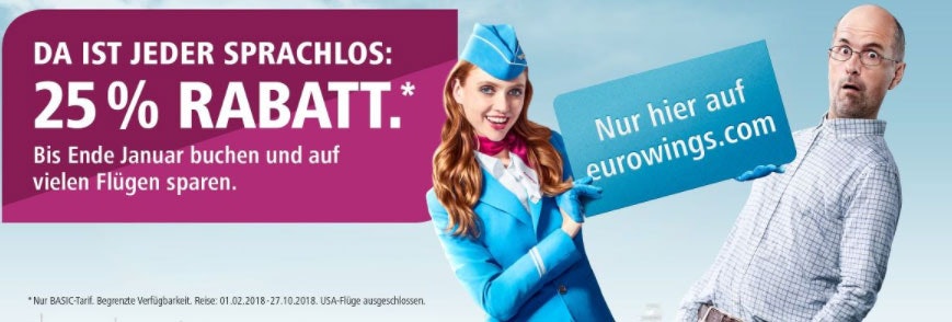 - Pack die Koffer! 25% Rabatt auf viele Flüge bei Eurowings, u.a. Inlandstrecken für 29,99€