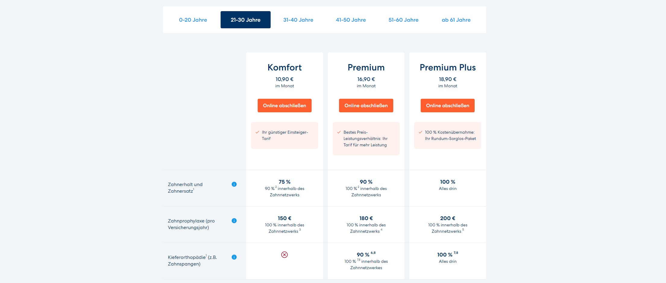 Die Zahnzusatzversicherung von DA Direkt lässt sich mit drei verschiedenen Service-Paketen, genannt Komfort, Premium und Premium Plus, abschließen. Dabei kann man von unterschiedlichen Zuschussmodellen für Zahnerhalt, Prophylaxe oder Kieferorthopädie profitieren – im All-in-Fall des Premium-Plus-Paketes sind 100% Erstattung in allen drei Bereichen möglich.