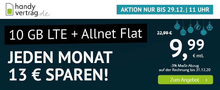 312€ in 2 Jahren sparen! LTE All 10GB Tarif für 9,99€/Monat - 10GB LTE, Allnet- & SMS-Flat, EU-Roaming