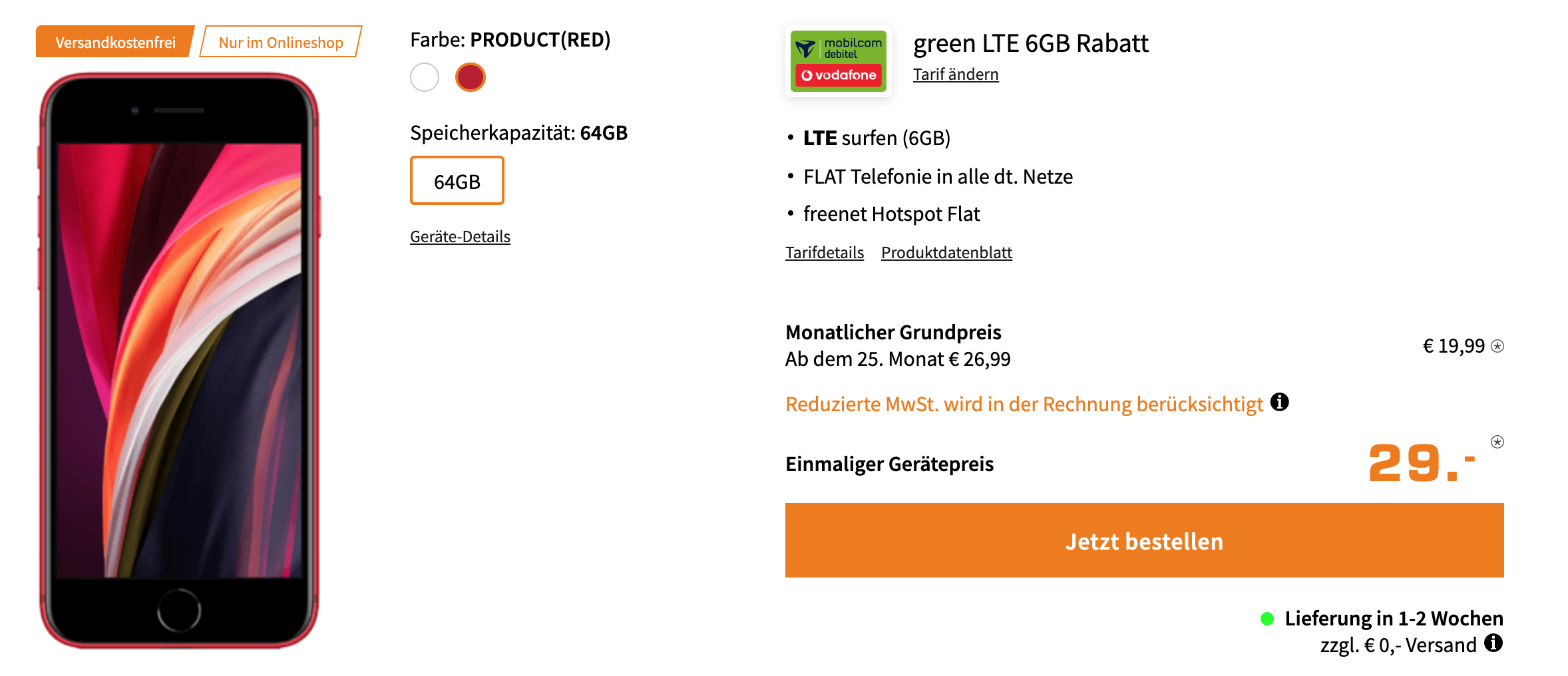 Apple iPhone SE (64GB) im green LTE 6GB Rabatt-Tarif für 23€/Monat - 6GB LTE 50 im Vodafone-Netz, Allnet-Flat & freenet Hotspot-Flat