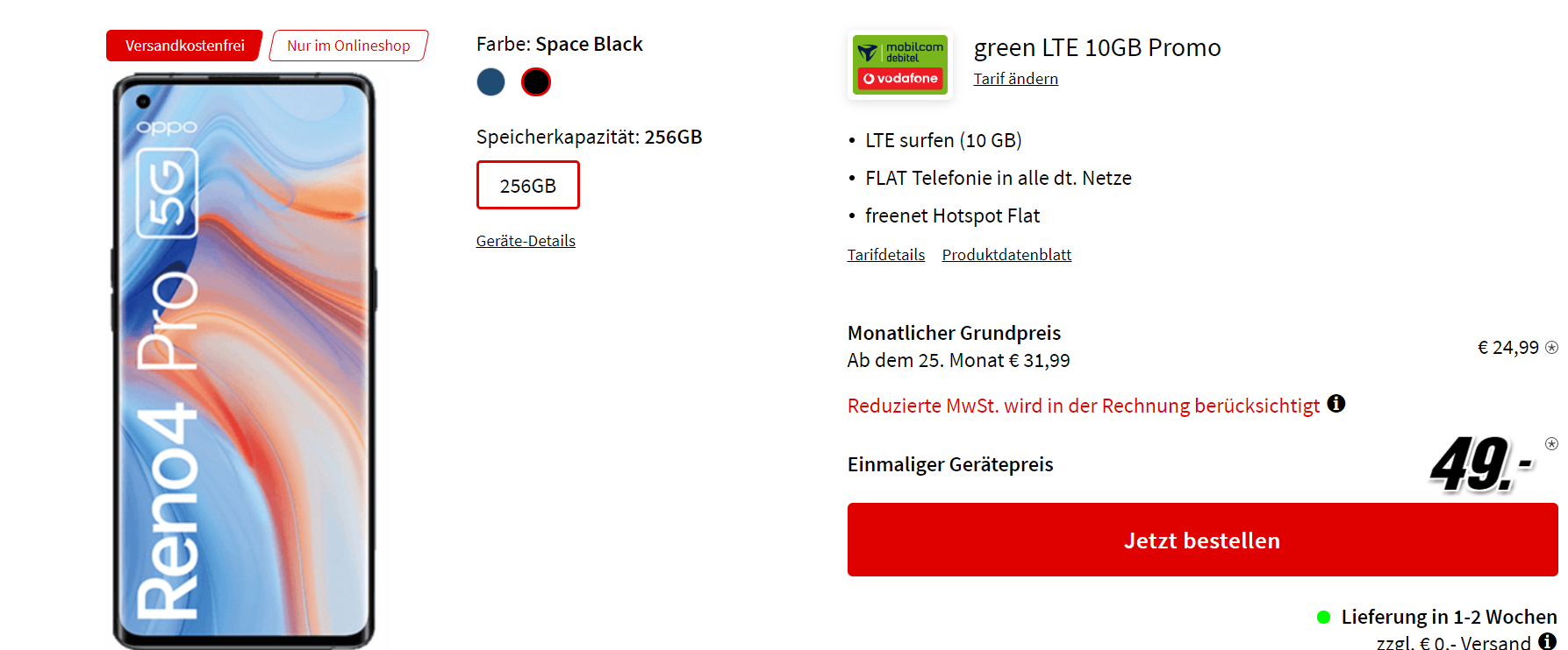 Oppo Reno4 Pro 5G im md-Vodafone green LTE 10-Tarif für 29€ monatlich - 10GB LTE 50, Allnet- & freenet Hotspot-Flat