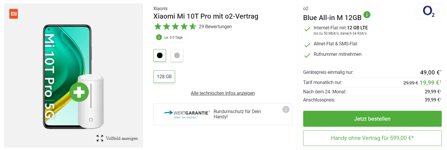 Nice! Xiaomi Mi 10T Pro (128GB) + Mi Luftbefeuchter im o2 Blue All-in M für 24€/Monat - 12GB LTE, Allnet- & SMS-Flat, EU-Roaming » Tarif rechnerisch fast kostenlos 👍